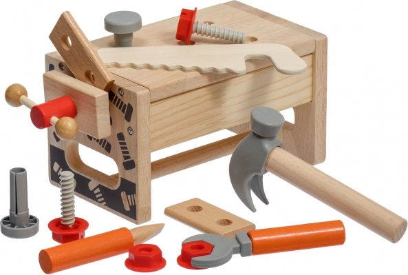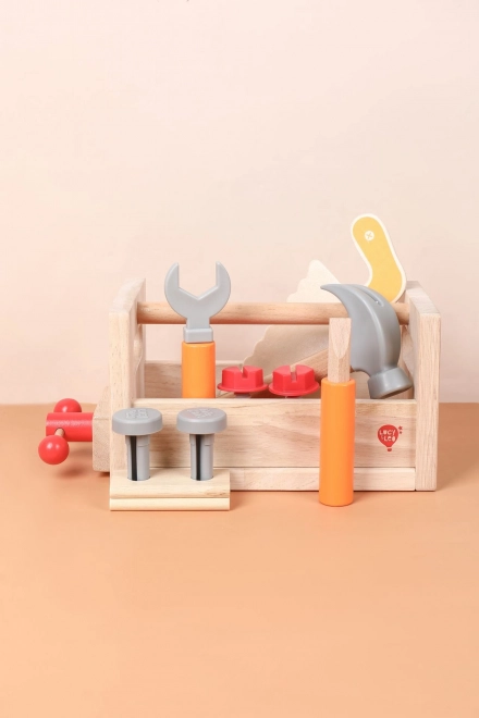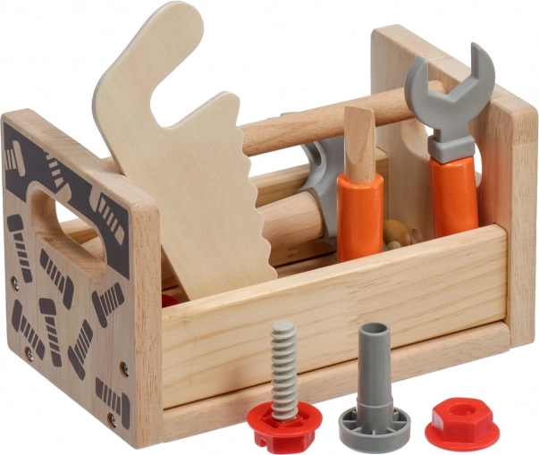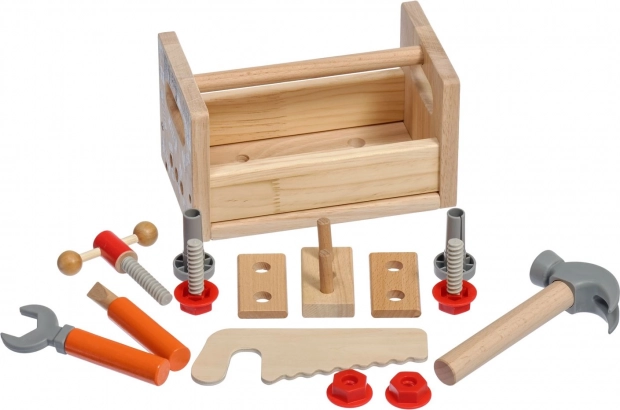 Komplektā ir daudzveidīgi bērnu instrumenti: āmurs, zāģis, skrūvgriezis, atslēga, skrūves un uzgriežņi, skava un gludas koka detaļas ar caurumiem. Katram priekšmetam ir sava vieta, tāpēc bērni apgūst kārtību un pamatprasmes darbā ar stiprinājumiem. Spēle veicina radošu būvēšanu, roku–acu koordināciju un pacietību.