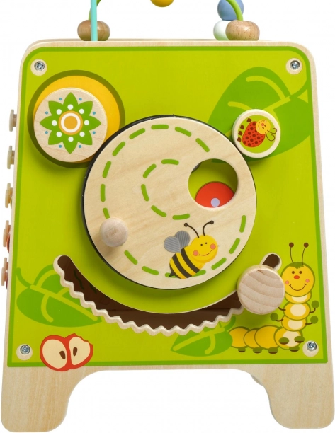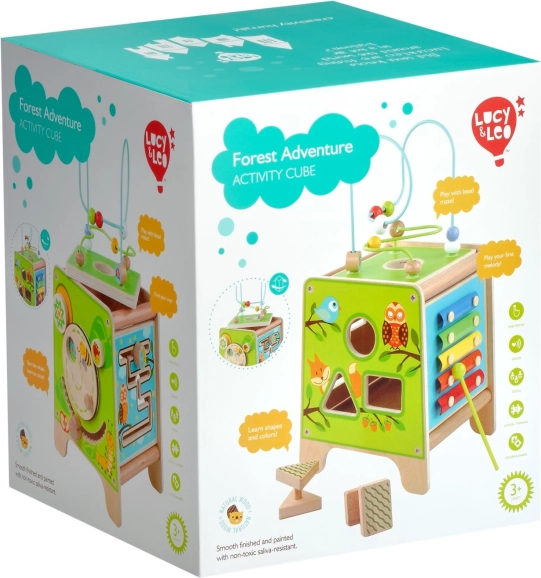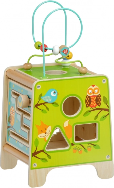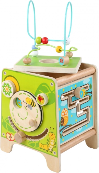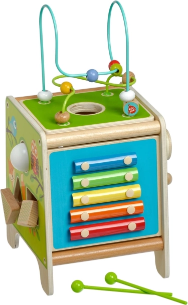 Šis krāsainais koka aktivitāšu kubs dāvā bērniem stundām ilgu jēgpilnu rotaļu. Augšējo krellīšu labirintu var noņemt un apgriezt kuba iekšpusē ērtai uzglabāšanai. Sānu virsmās bērni atradīs ksilofonu ar vālītēm, divdaļīgu rotējošu ģeometrisko formu ieliktnīšus, motorikas labirintu, griežamu ratiņu, grozāmus elementus un aizraujošu spēli ar tapstiņu bīdīšanu pa rieviņu.