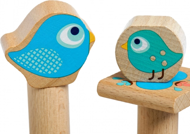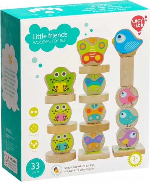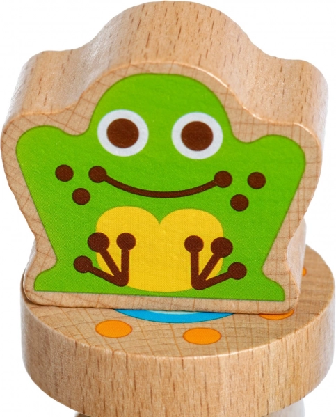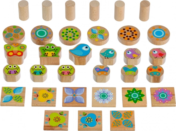 - 33 koka detaļas ar krāsainām vardīšu, putniņu un tauriņu ilustrācijām.