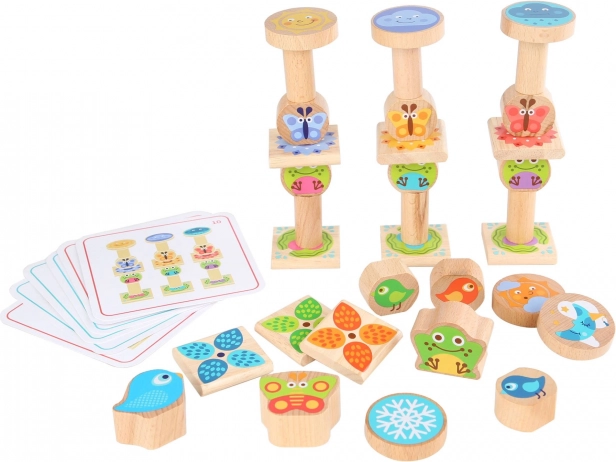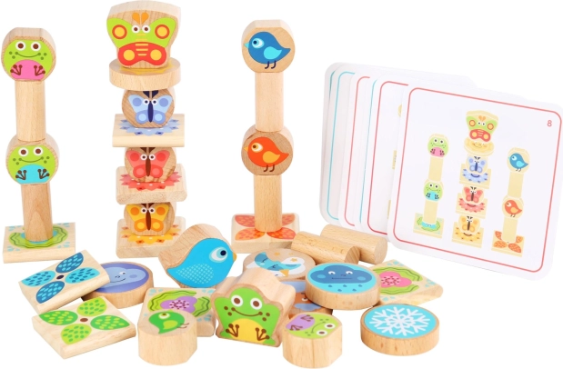 Atklājiet jautru koka līdzsvara spēli bērniem ar vardīšu, putniņu un tauriņu motīviem. Komplektā ir 33 detaļas un abpusējas paraugu kartes, kas attīsta smalko motoriku, acu–roku koordināciju, pacietību un radošumu. Kvalitatīvie koka klucīši ar noapaļotām malām ir droši mazām rociņām, un tos var ielikt ērtā lina maisiņā līdzi ceļam.