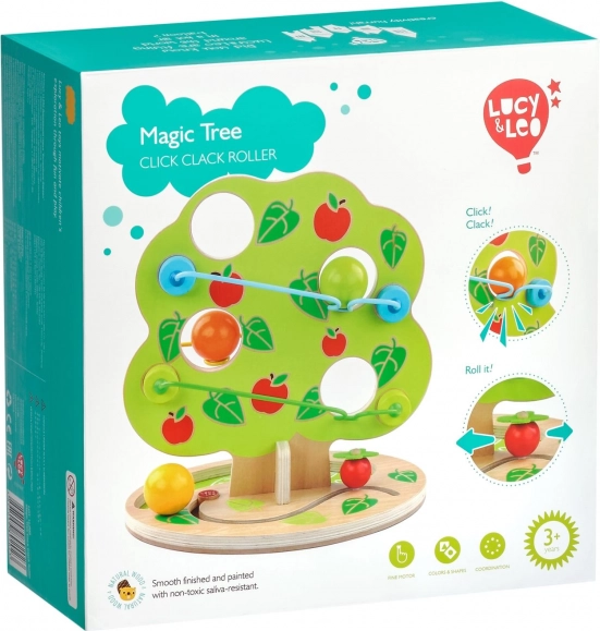Vizuāli pievilcīgais bumbiņu tobogāns koka formā piedāvā vairākas kaskādveida sliedes sānos. Vienkārši novieto vienu no gludajām, lielajām koka bumbām augšā un vēro, kā tā ripo lejup, izdodot ritmisku “klikšķēšanu”, līdz apstājas koka pakājē. Rotaļlieta ir ideāla aktīviem bērniem, kuri mīl kustību, skaņas un cēloņu–seku atklāšanu.