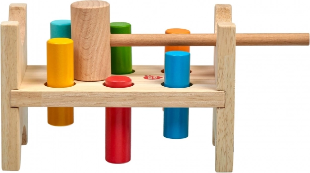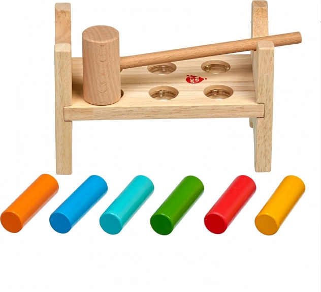 Seši krāsaini tapoņi un koka āmuriņš māca bērniem precīzu satvērienu, sitiena spēku un acu–roku koordināciju.