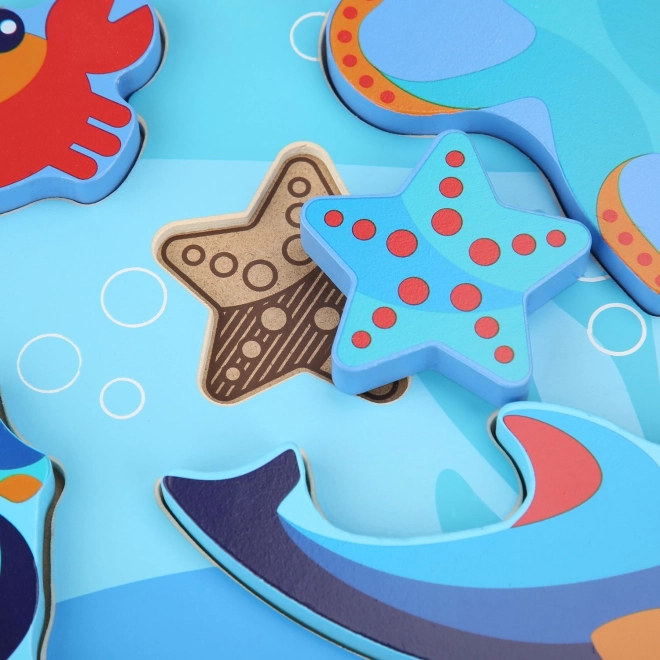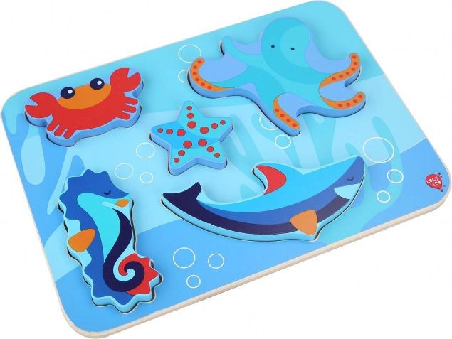 Bērnu koka puzle ar jūras dzīvnieku motīvu ir radīta rotaļīgai mācīšanās pieredzei. Seši krāsaini gabali – piemēram, astoņkājis, jūras zvaigzne un jūras zirdziņš – precīzi ieguļ izfrēzētos iedobumos uz izturīgas pamatnes ar okeāna motīvu. Gabali ir pietiekami lieli ērtai satveršanai un, pateicoties biezumam, var stāvēt patstāvīgi.