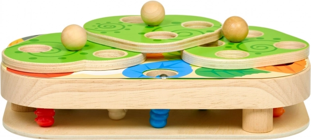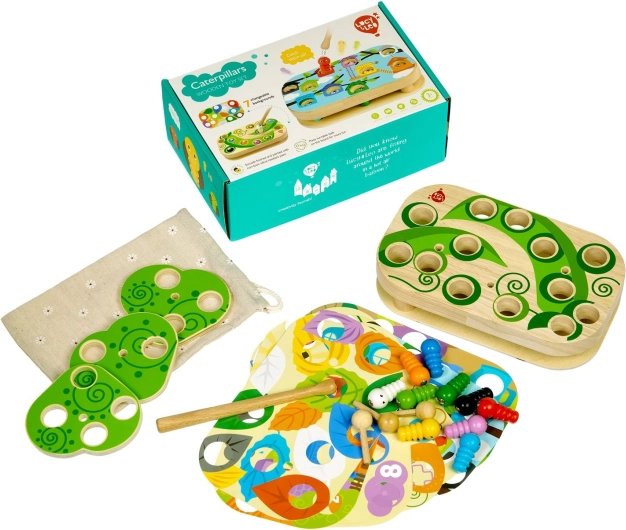 Drošā magnētiskā nūjiņa palīdz bērniem ievietot krāsainos kāpurus atverēs. Attīsta smalko motoriku, koordināciju un pacietību.