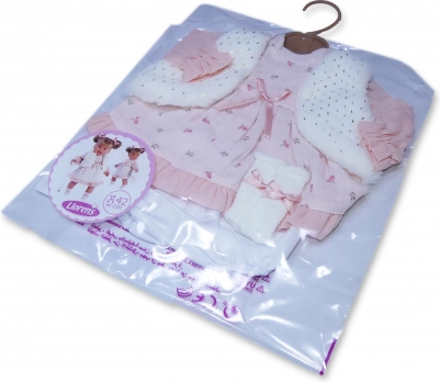 Stilīgs 4 daļu apģērba komplekts lellei 42 cm no zīmola LLORENS priecēs ar maigi rozā kleitu, mīkstu vestīti un biksītēm uz pakaramā. Ražots Spānijā, ideāli piemērots ikdienas rotaļām un svinīgiem brīžiem. Piemērots no 3 gadiem.