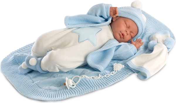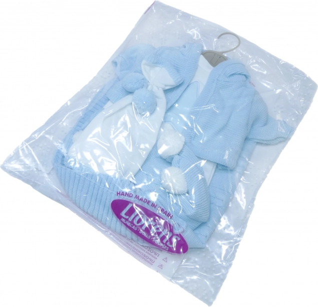 Elegants tērps Llorens leļļu mazulim ar dekoratīvu sedziņu un mīkstu lakatiņu ar bumbiņām, ideāli piemērots lellēm 40–42 cm izmērā.