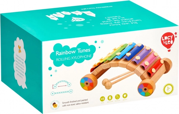Varavīksnes ksilofons LUCY & LEO apvieno mūzikas instrumentu un ripojošu rotaļlietu vienā. Metāla lameles varavīksnes krāsās aicina izmēģināt pirmās melodijas, savukārt izturīgā koka pamatne ar riteņiem veicina aktīvu rotaļu. Bērni dabiski mācās atšķirt skaņas augstumus, sajust ritmu un attīstīt roku–acu koordināciju.
