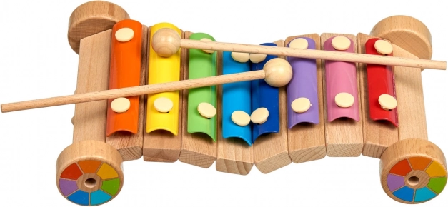 Jautrs varavīksnes ksilofons uz koka šasijas ar riteņiem attīsta muzikālo dzirdi, ritma izjūtu un sīko motoriku. Krāsainās metāla lameles izdod skaidras notis, komplektā ir 2 koka vālītes. Drošs izpildījums un izturīga konstrukcija padara to par ideālu izglītojošu rotaļlietu pirmsskolas vecuma bērniem.