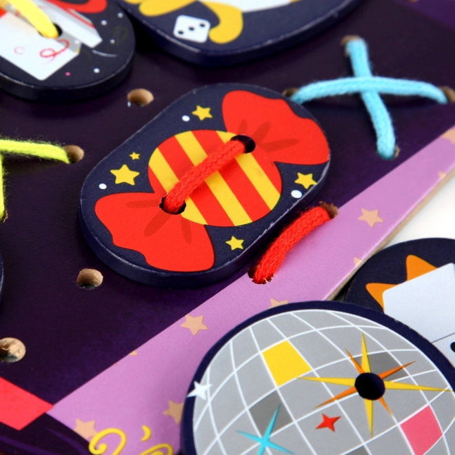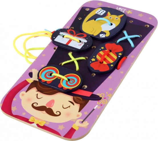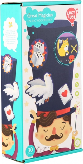 Šis jautrais vīšanas un veršanas komplekts ar burvju mākslinieka motīvu aicina bērnus fantāzijas pasaulē. Pie lielās pamatnes ar burvju mākslinieka galvu un cepuri, izmantojot aukliņas, var piestiprināt krāsainus aksesuārus – no trusīša un monētām līdz noslēpumainām kārtīm. Spēlējoties bērni trenē roku–acu koordināciju, pacietību un radošumu.