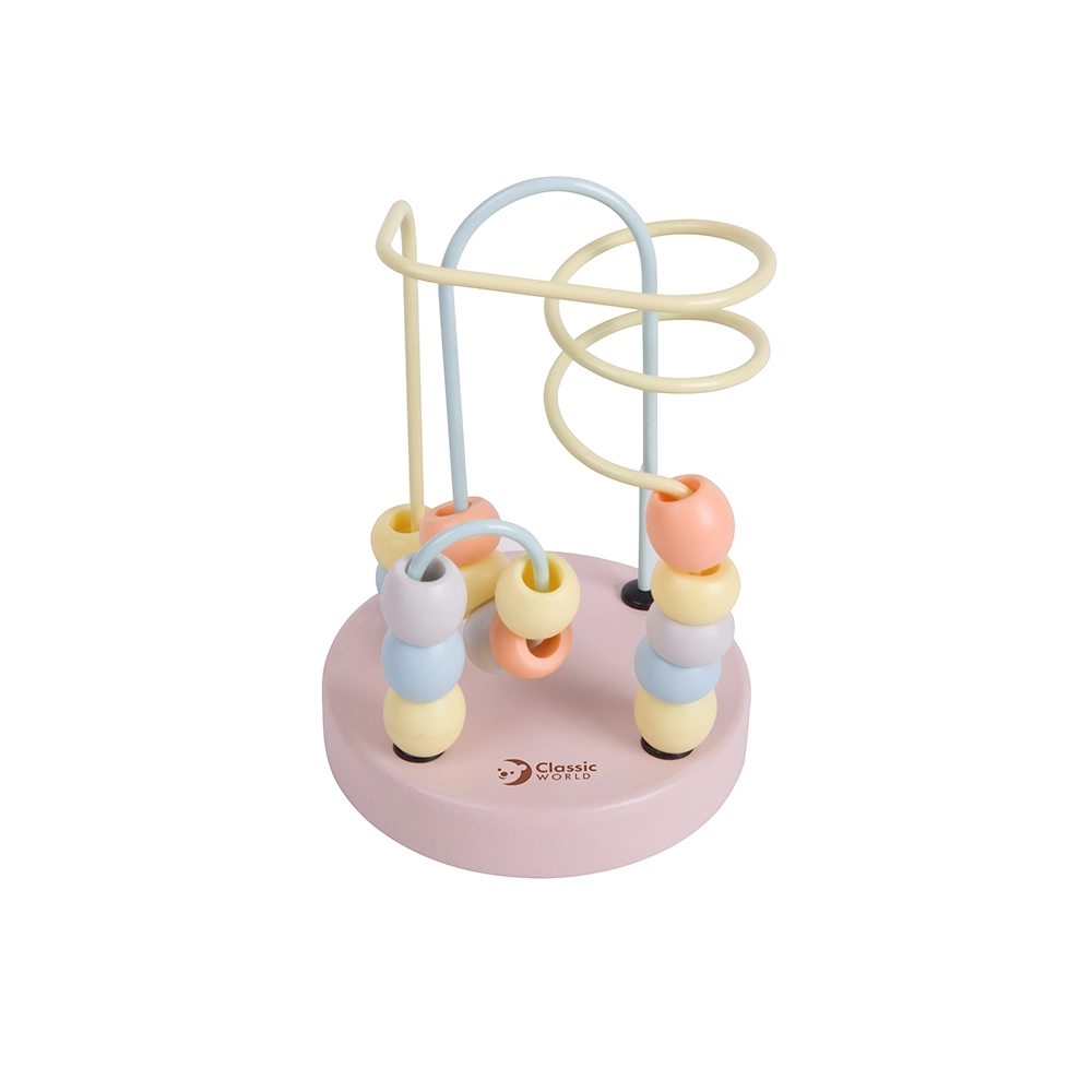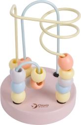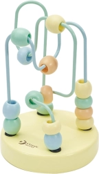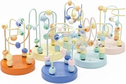 Uz metāla stieplēm izvietotas skaistas koka krelles, kuras bērni var brīvi bīdīt, trenējot pirkstu un roku kustību precizitāti.