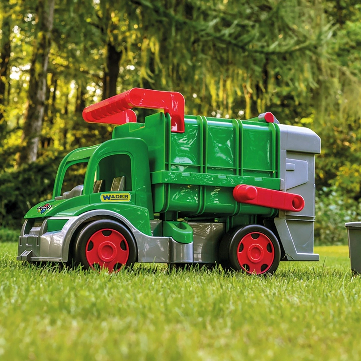 Atkritumu savākšanas auto WADER GIGANT FARMER bērniem piedāvā reālistisku pilsētas sakopšanas spēli. Pateicoties kustīgam pacēlājam var viegli iztukšot pievienoto konteineru, atveramais aizmugurējais vāks atvieglo iekraušanu un izkraušanu, bet brīvgaitas riteņi nodrošina plūdenu kustību. Nestspēja līdz 50 kg ļauj bērniem apsēsties uz auto un turēties pie praktiskā augšējā roktura, savukārt priekšējais āķis ļauj vilkt vai savienot ar citu transportlīdzekli vai virvi.
