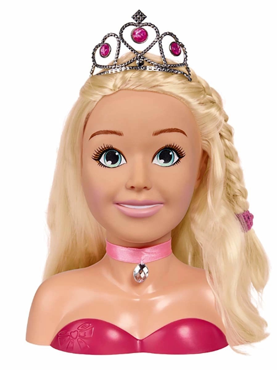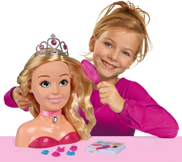 Šī apburošā veidošanas galva ar gariem blondiem matiem un rozā lenti ar akmentiņu ir ideāla mazajām frizierēm un vizāžistēm. Pateicoties piederumu komplektam – no sudraba kronīša līdz birstei, sprādzītēm un gumijām, kā arī grima paletei – bērni viegli radīs pasakainas frizūras un maigu grimu.