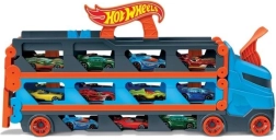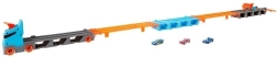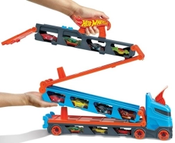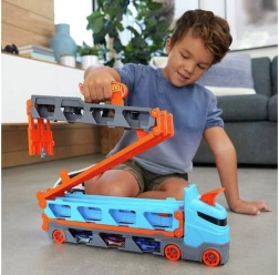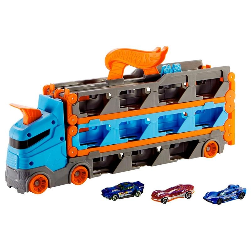 Pārvērt kravas auto dažu mirkļu laikā par pilnvērtīgu sacīkšu trasi. Transportieris slēpj līdz pat 20 mašīnītēm aiz caurspīdīgiem logiem, lai tava kolekcija vienmēr būtu redzama. Pavelkot aiz roktura, piekabe izklājas par divjoslu trasi 1,8 m garumā, bet kabīne pārtop par divkāršu palaišanas staciju godīgiem startiem.