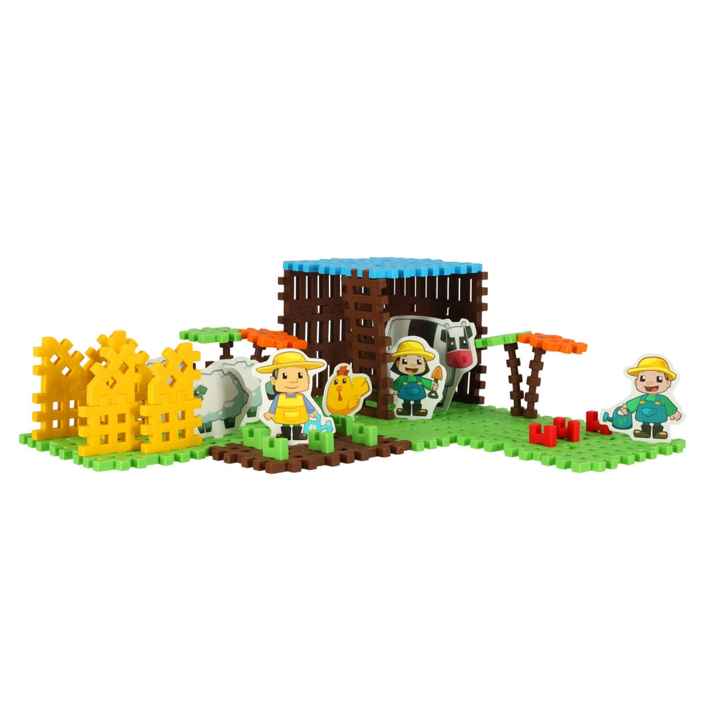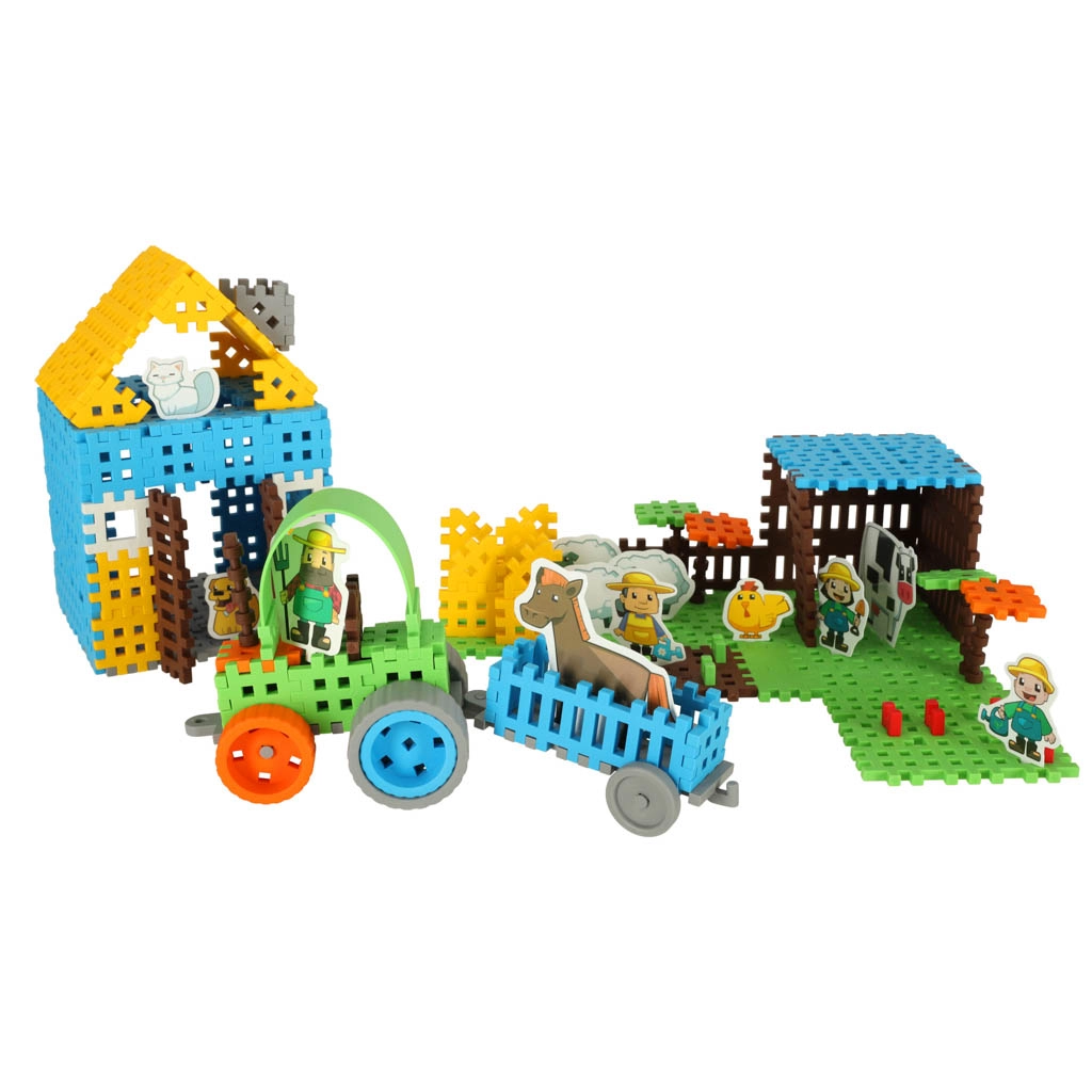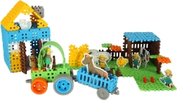 Dodies uz lauku fermu! Komplektā ir komponenti, lai izveidotu savu fermu, tostarp traktors ar piekabi un zemnieku tēli ar dzīvniekiem, piemēram, zirgu, govi un vistu. Bērni iepazīst lauku dzīvi, attīsta iztēli un sīko motoriku.