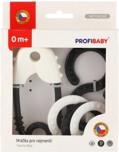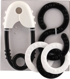 Melnbalto grabuļu komplekts, ideāls mazu bērnu redzes un dzirdes stimulēšanai. Perfekts izmērs bērna rociņām.