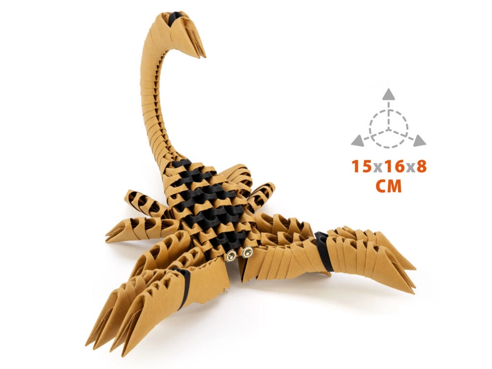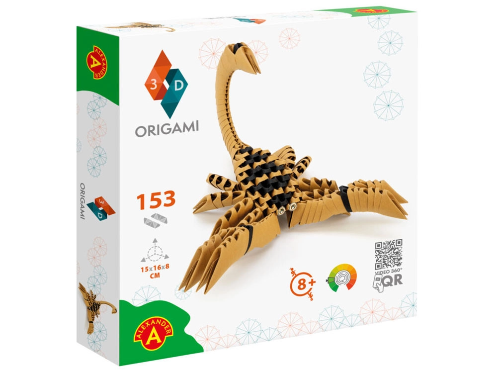 3D origami Skorpions no Alexander ir aizraujoša un nomierinoša radoša nodarbe bērniem un pieaugušajiem. Elementiem ir patentēta forma ar iespiestu locījuma līniju, tādēļ pamatmoduli saliksiet ar trim vienkāršām kustībām un pēc tam tos savā starpā savienosiet bez līmes. Gatavais modelis ir dekoratīvs un kļūs par oriģinālu istabas rotājumu.