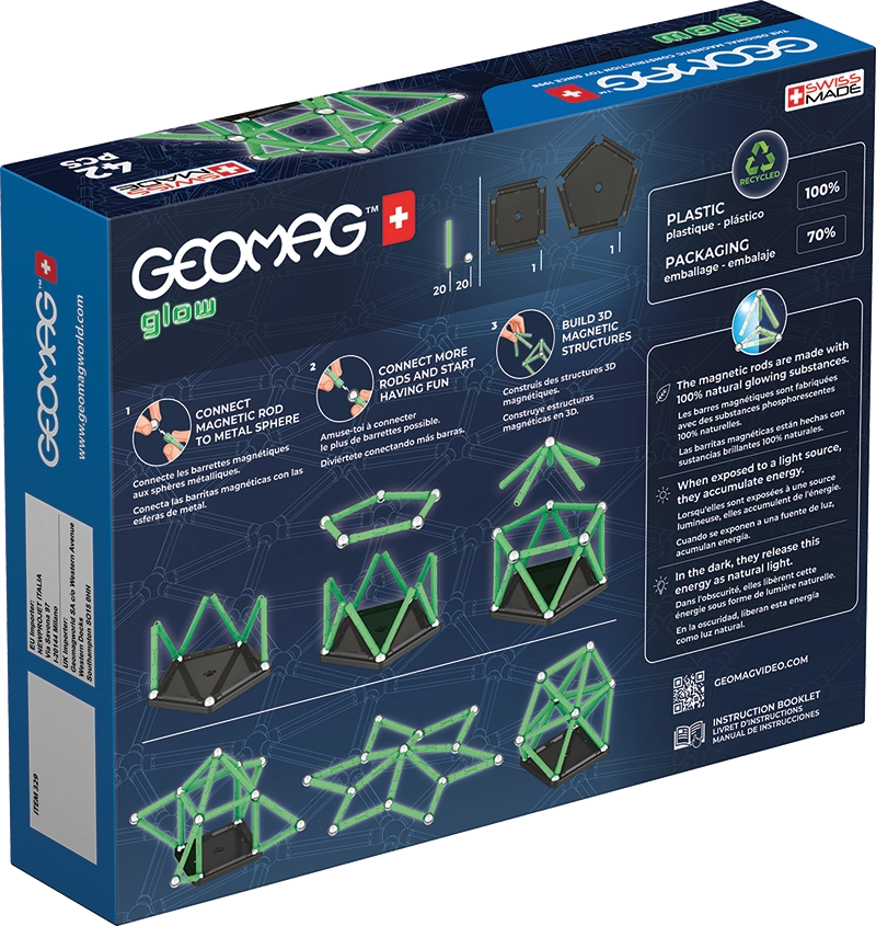 Atklāj magnētiskās konstruktoru pasaules burvību ar GEOMAG Glow, kurā ir 42 detaļas, kas tumsā fosforescē. Apgaismo, izslēdz gaismu un vēro, kā tavi veidojumi mirdz! Komplekts veicina kreativitāti, sīko motoriku un telpisko iztēli, un tas ir izgatavots ar Šveices precizitāti un uzsvaru uz drošību.