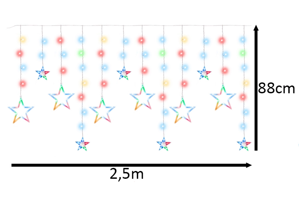 Ienesiet savās mājās svētku noskaņu ar LED gaismas aizkaru ar zvaigznēm, 2,5 m garu un ar 138 LED. Tas nodrošina daudzkrāsainu apgaismojumu, 8 gaismas režīmus un barošanu no tīkla nepārtrauktai darbībai bez baterijām. Ideāli piemērots kā svētku dekorācija un mājīgs vakara apgaismojums visa gada garumā.