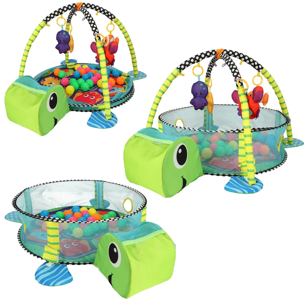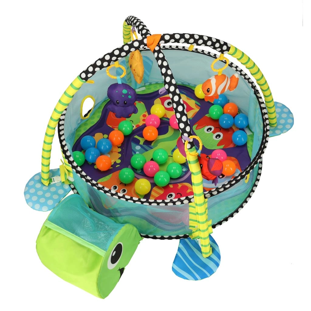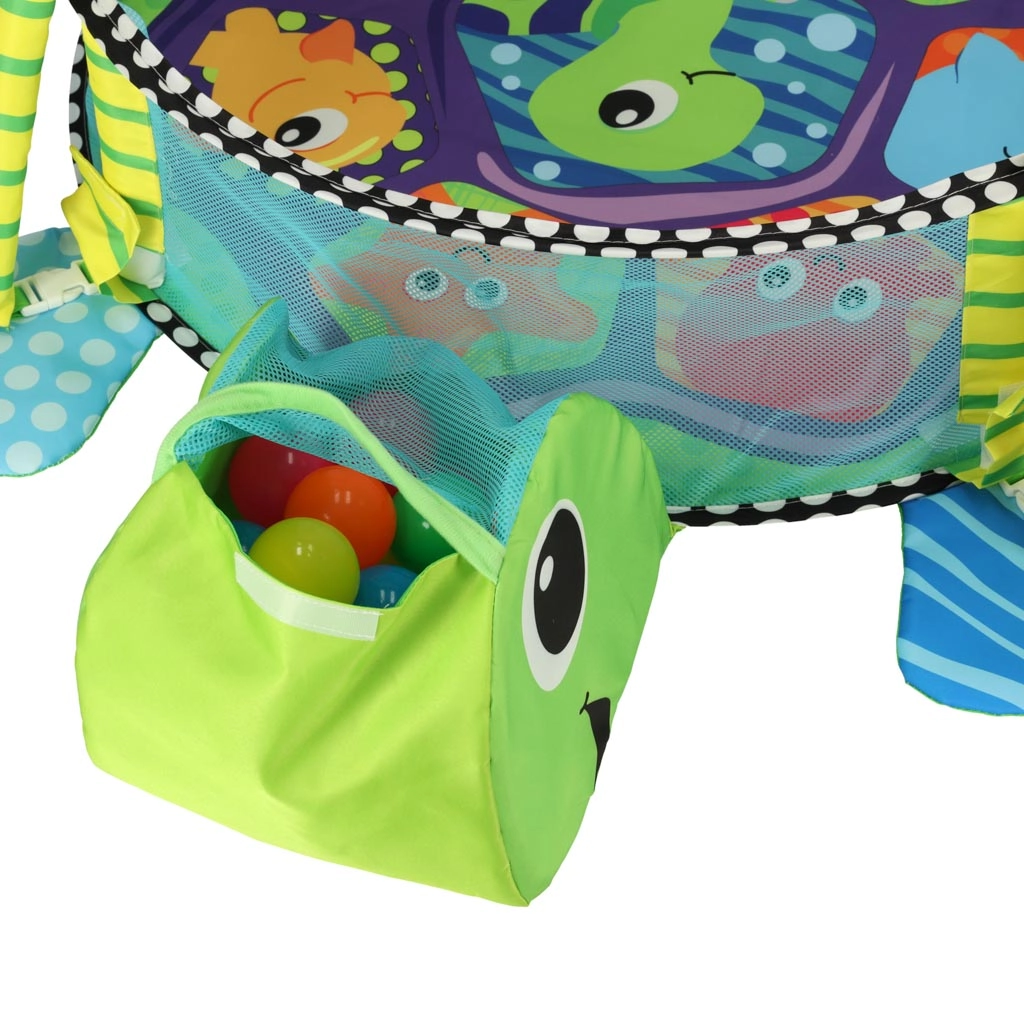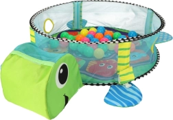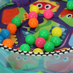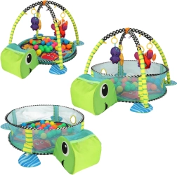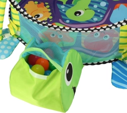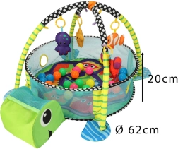 Vienā vietā iegūstat laukumu rotaļām gan uz muguras, gan uz vēdera, un, uzstādot sietu, arī drošu bumbiņu baseinu ar 30 bumbiņām.
