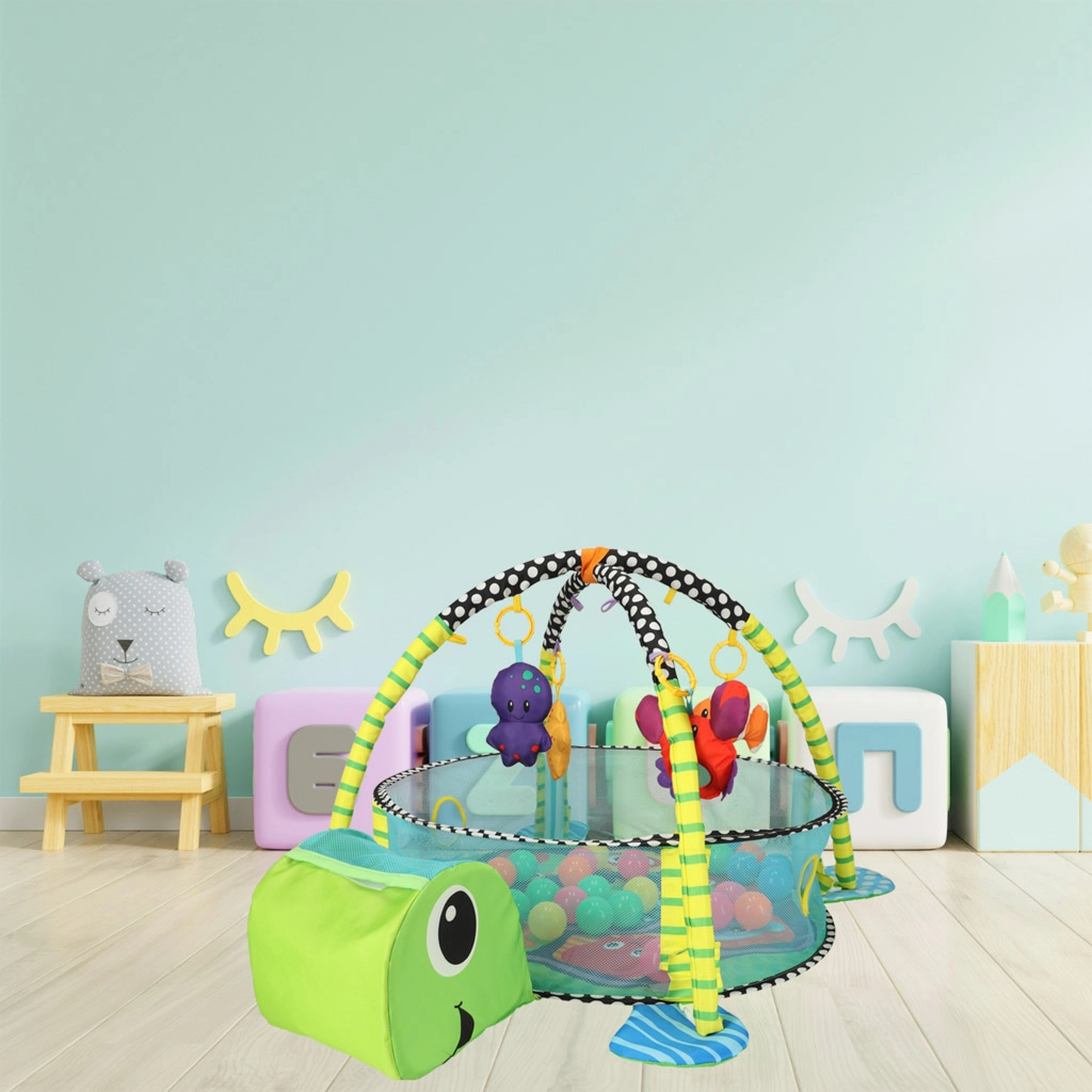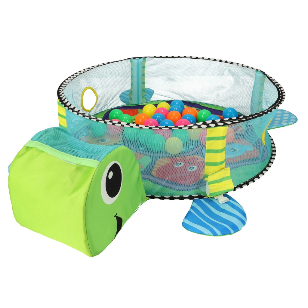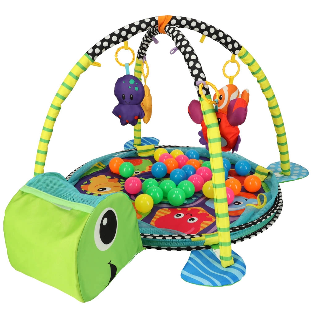 Vienā vietā iegūstat laukumu rotaļām gan uz muguras, gan uz vēdera, un, uzstādot sietu, arī drošu bumbiņu baseinu ar 30 bumbiņām.
