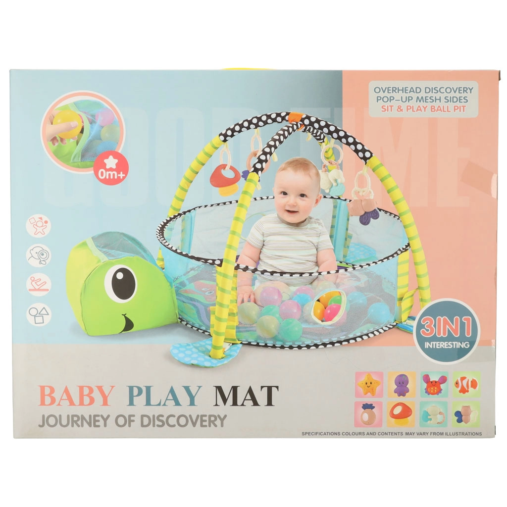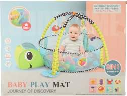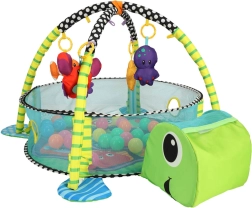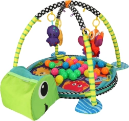 Šis daudzfunkcionālais paklājiņš nodrošina mazulim drošu vidi atklājumiem jau no pirmajām dienām. Divas arkas ar piekarināmām rotaļlietām palīdz bērnam mācīties satvert, sekot ar acīm un koordinēt kustības. Sietveida malas viegli pārtop par baseinu ar 30 krāsainām bumbiņām, kas veicina patstāvīgu sēdēšanu un sensorās spēles.