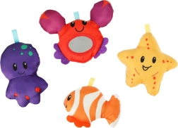 Zivtiņa, astoņkājis, jūras zvaigzne un krabis ar spogulīti stimulē redzi, tausti un acu‑roku koordināciju, aicinot bērnu pētīt un satvert.