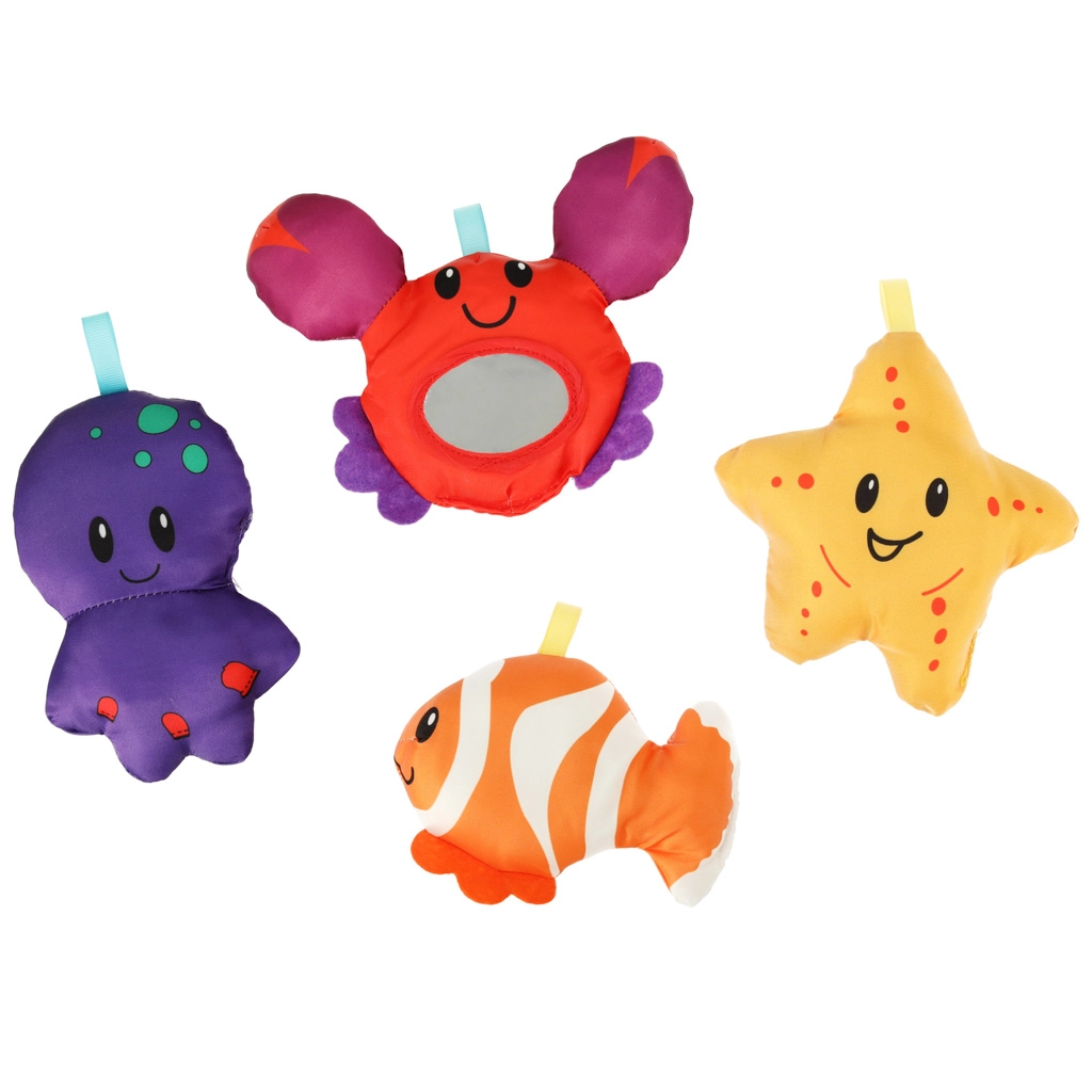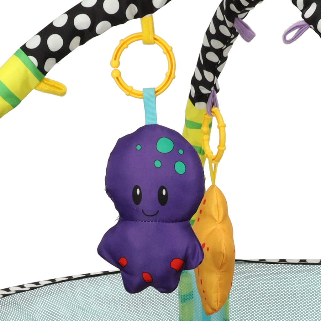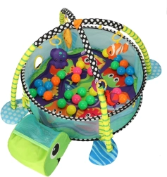 Komplektā ir mīkstas rotaļlietas – zivtiņa, astoņkājis, jūras zvaigzne un krabis ar spogulīti, kas attīsta redzi, tausti un uzmanību. Vieglā konstrukcija ātri salokāma, tāpēc tā ir ideāla ceļošanai un nelielām telpām.