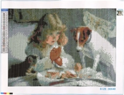 Detalizēts motīvs ar meiteni un sunīti 30 × 40 cm izmērā pēc pabeigšanas skaisti mirdz un izcili izskatās rāmī jebkurā interjerā.