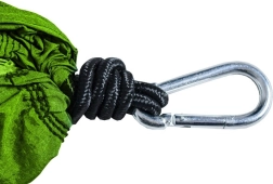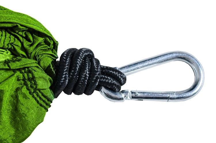 Komplektā ietilpst karabīnes un stipras virves ar iekšējo stiepli, kas ļauj viegli un droši piestiprināt pie koku zariem vai citiem stabiliem enkurpunktiem.