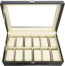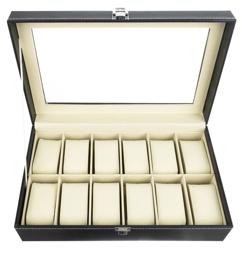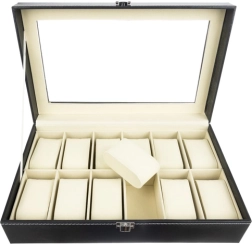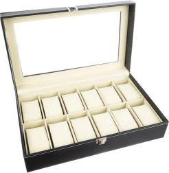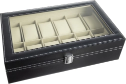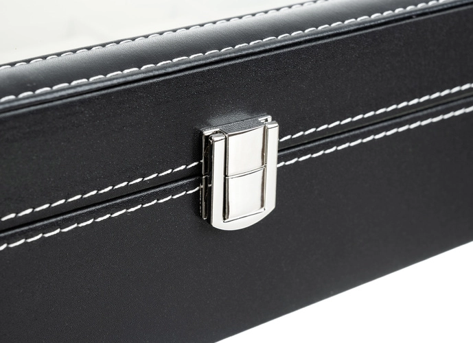 Elegantais pulksteņu un rotaslietu organizators ar 12 nodalījumiem droši uzglabā un skaisti izstāda jūsu kolekciju. Tam ir caurspīdīgs vāks, melna apdare ar kontrastējošu šuvumu un mīksts polsterējums. Magnētiskā aizdare notur saturu drošībā, noņemamie spilventiņi pasargā no skrāpējumiem un ļauj uzglabāt arī aproces, kaklarotas vai gredzenus. Lieliska dāvana gan sievietēm, gan vīriešiem un stilīgs akcents jebkurā interjerā.