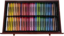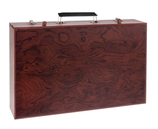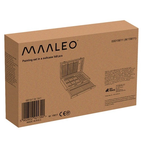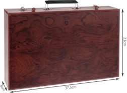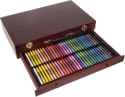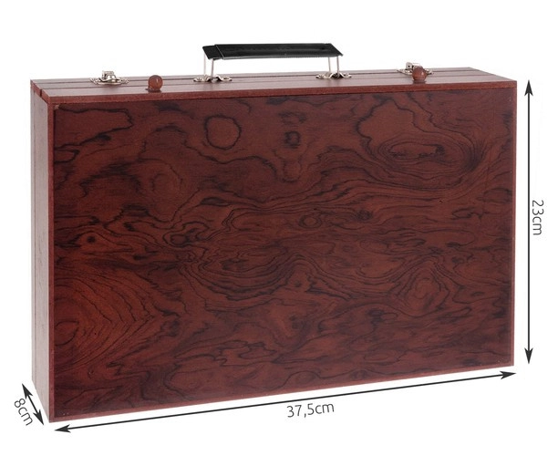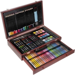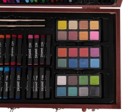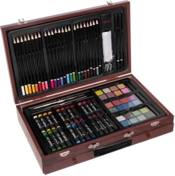 Pilns mākslas komplekts elegantā koka koferī ar atvilktni iepriecinās gan mazos, gan lielos māksliniekus. Tas satur līdz 148 detaļām: vaskkrītiņi, pasteļi, krāsainie zīmuļi, akvareļkrāsas, otas un citas piederumus. Praktiskais koferis ar rokturi un metāla aizdares mehānismiem nodrošina ērtu pārnēsāšanu, pārskatāmu kārtojumu un ātru piekļuvi visām vajadzīgajām lietām.