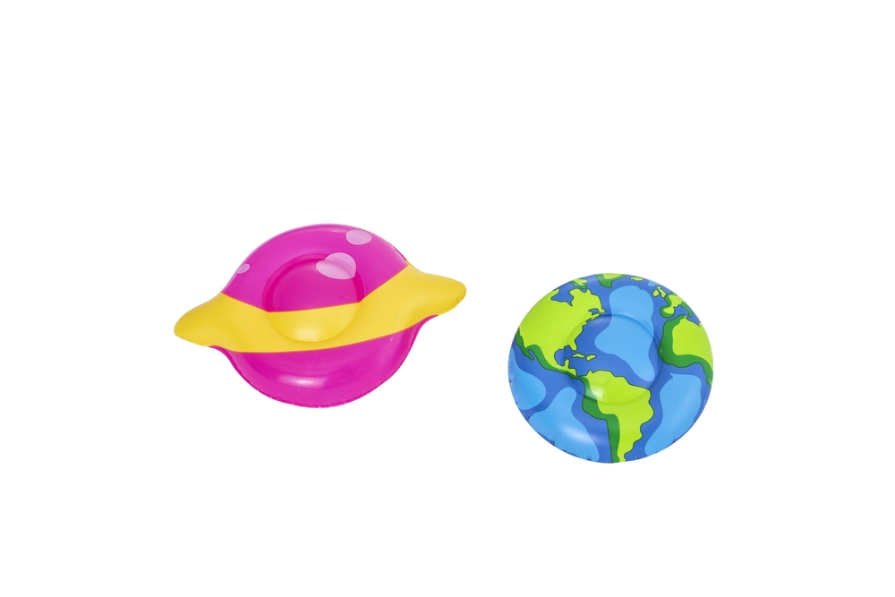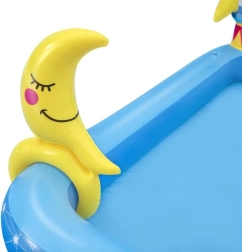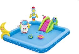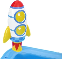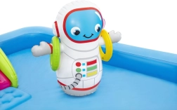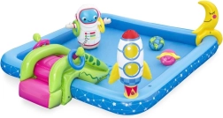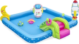 Uzpūšamais ūdens rotaļu laukums Galaktika BESTWAY sniedz bērniem bezgalīgas izklaides stundas. Šis košais baseina komplekts ar kosmisku tematiku ietver jautrus elementus, piemēram, slidkalniņu, smidzinātāju un riņķu mešanas spēli, izgatavots no augstas kvalitātes PVC materiāla.