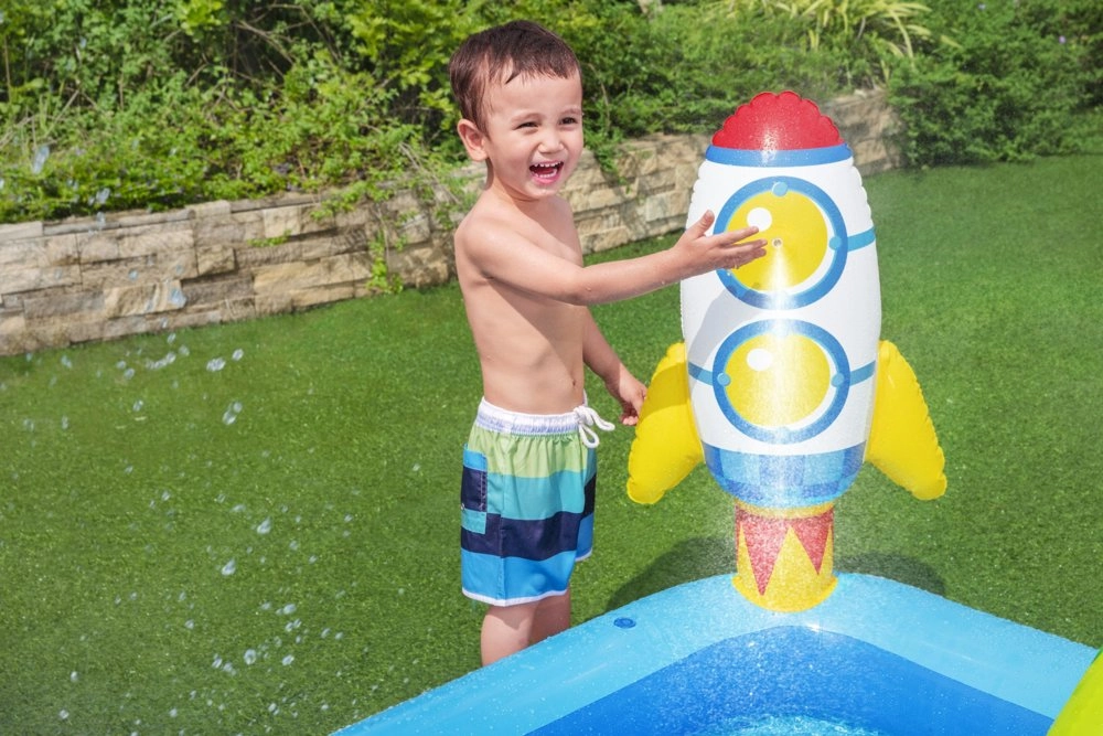Ar uzpūšamo ūdens rotaļu laukumu Galaktika BESTWAY bērnus sagaida interaktīva un dinamiska izklaide. Šis kompaktais baseins piedāvā virkni atrakciju, kas veicina radošas spēles un palīdz atvēsināties vasaras dienās. Krāsainie elementi un kosmiskā tematika ir veidoti maksimālam spēļu priekam.