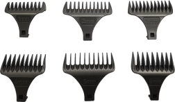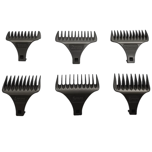 Seši vadotņu ķemmuzgaļi precīzai garuma kontrolei. Piemēroti dažādiem matu griezumiem un bārdas veidošanai.