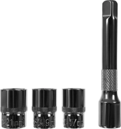 Komplektā atradīsiet visu nepieciešamo: 3 uzgaļus 17/19/21 mm un pagarinājumu labākai piekļuvei. Kvalitatīvs tērauda izpildījums iztur deformācijas un plaisāšanu, silikona elementi paaugstina darba komfortu. Iekļauts arī izturīgs futlāris, kas aizsargā instrumentu uzglabāšanas un transportēšanas laikā.