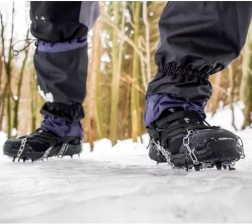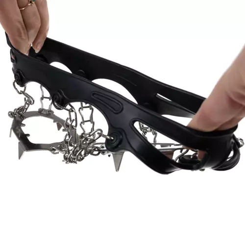 - Augsta saķere: 12 naglas katrai pēdai + nerūsējošas ķēdītes drošībai uz ledus un sniega.