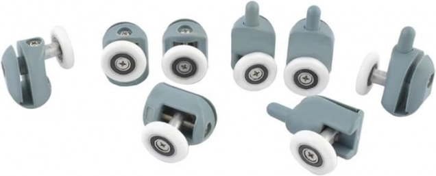 Šis dušas kabīņu riteņu komplekts satur astoņus riteņus, kas paredzēti universālai izmantošanai. Katrs ritenis ir aprīkots ar izturīgu plastmasas un metāla mehānismu, kas nodrošina vienmērīgu slīdēšanu dušas durvīm.