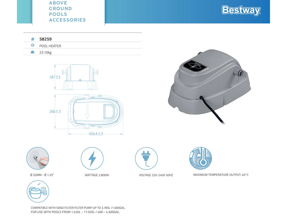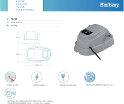 BESTWAY sildītājs ir ideāla izvēle, lai pagarinātu peldsezonu un palielinātu komfortu Jūsu virszemes baseinā. Pateicoties 2800 W jaudai, tas spēj ātri uzsildīt ūdeni un uzturēt patīkamu temperatūru. Digitālā regulēšana nodrošina precīzu iestatīšanu, savukārt iebūvētā aizsardzība pret pārkaršanu un RCD (PRCD) aizsardzība rūpējas par drošu darbību.