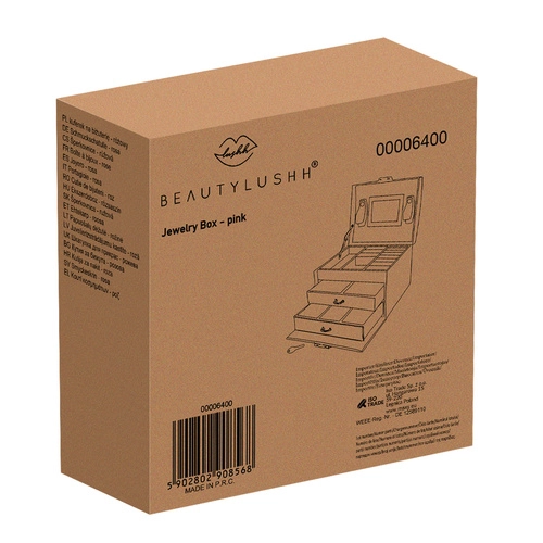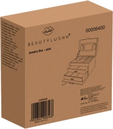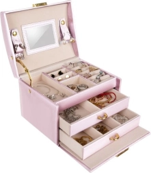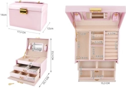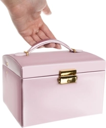 Elegantā rozā rotaslietu lādīte ar 20 nodalījumiem, 2 atvilktnēm un slēdzeni ar atslēgu glabās jūsu dārglietas droši un nevainojamā kārtībā. Tai ir mīksts oderējums pret skrāpējumiem, praktiskas gredzenu ruļļveida ieliktnes, siksniņas ar spiedpogām aprocēm un ķēdītēm, iebūvēts spogulītis un augšējā roktura cilpa ērtai pārnēsāšanai.