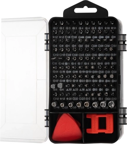 Komplektā ietilpst bīti Torx/Torx ar caurumu, Phillips, plakani, trīsstūris, Pentalobe, Y un citi – ideāli tālruņiem, klēpjdatoriem, pulksteņiem un brillēm.