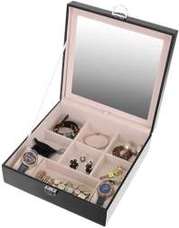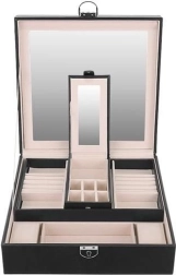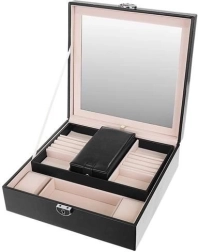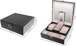 Šī rotu lādīte ir lieliska katrai rotu un modes aksesuāru cienītājai. Tā piedāvā vairākus glabāšanas līmeņus, tostarp izņemamu ceļojumu kastīti, kas piešķir daudzpusību un praktiskumu, ko novērtēsiet ceļojot. Vākā integrētais spogulis atvieglo rotu uzlikšanu un pielāgošanu.