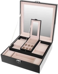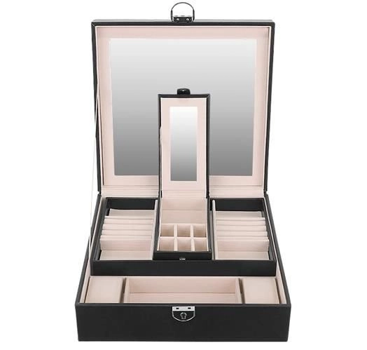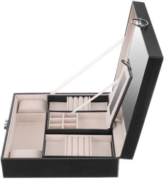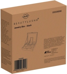 Elegantā rotu lādīte Beautylushh melnā krāsā ir ideāla jūsu vērtslietu organizēšanai un aizsardzībai. Ar daudzlīmeņu glabāšanas vietu un spoguli tā piedāvā visu nepieciešamo pārskatāmai rotu uzglabāšanai.