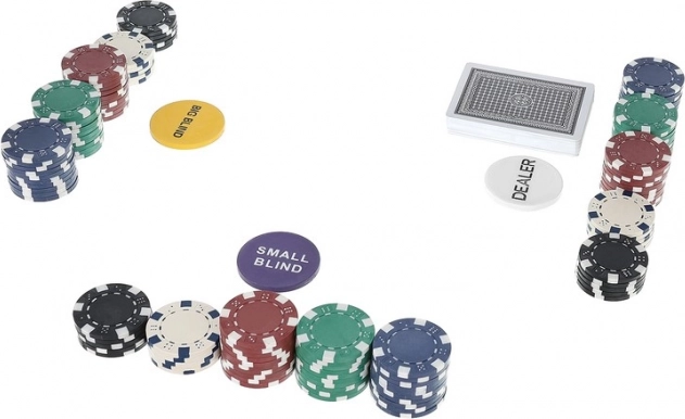 Iepakojumā ietilpst arī funkcionālie žetoni DEALER, SMALL BLIND un BIG BLIND ērtai spēles organizācijai, 2× 54 kārtis nepārtrauktai kavu maiņai un 5 kauliņi papildu galda izklaidei. Komplekts ideāli piemērots mājas spēļu istabām, ballītēm un draudzīgām sacensībām.