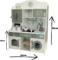 Šīs virtuvītes izmēri ir 62 cm x 26 cm x 85 cm, kas padara to ideāli piemērotu jebkurai bērnu istabai. Pateicoties neitrālajām krāsām, tā viegli iekļaujas jūsu interjerā.