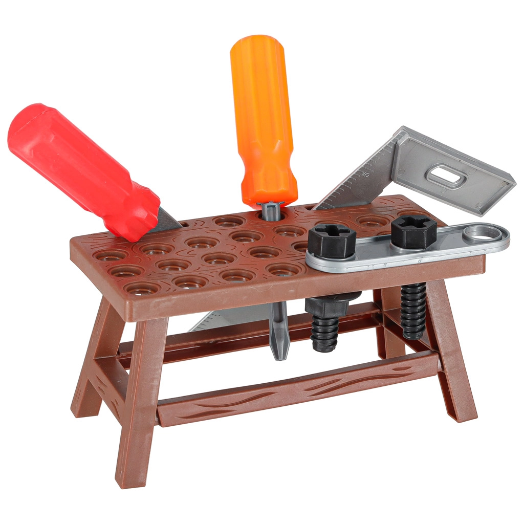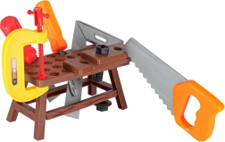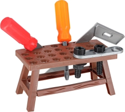 Pilns bērnu darba galds ar instrumentiem mazajiem meistariem – līdz pat 48 detaļām radošai spēlei un mācībām. Pateicoties košajām krāsām un drošam plastmasas izpildījumam, bērni vingrina sīko motoriku un koordināciju. Komplektā ietilpst skrūves un uzgriežņi, plastmasas urbjmašīna/skrūvgriezis, āmurs, zāģis, knaibles un perforētas detaļas būvēšanai. Praktisks uzglabāšanas konteiners palīdz visu turēt kopā un atvieglo pārnēsāšanu.