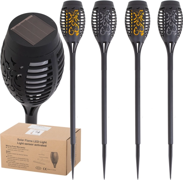 Izveidojiet burvīgu noskaņu dārzā ar četru saules lāpu lampu komplektu. Katrai lampai ir 12 LED, kas rada plīvojošas liesmas efektu, un tās pēc krēslas iestāšanās automātiski ieslēdzas. Saules barošana bez vadiem, vienkārša iedurama uzstādīšana un silta, dekoratīva gaisma celiņiem, dobēm un lapenēm.