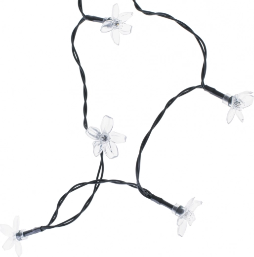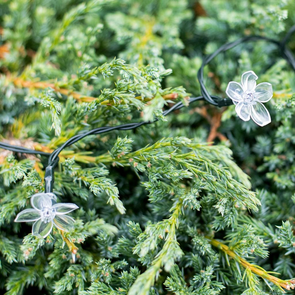 Dekoratīvā saules virtene ar caurspīdīgiem ziediņiem katru nakti piešķirs jūsu dārzam pasakainu atmosfēru. Panelis dienā uzkrāj saules enerģiju, un pēc tumsas iestāšanās gaismas automātiski iedegas. Tumši zaļais kabelis pazūd starp augiem, tādēļ izcelsies tikai maigi mirdzošo ziedu efekts.