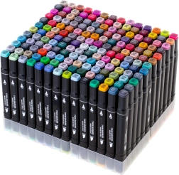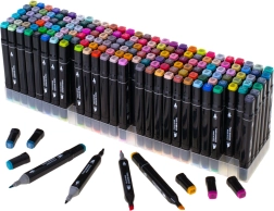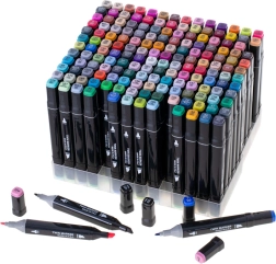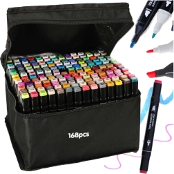 Aizdedzini savu radošumu ar komplektu 168 divpusēju spirta marķieru praktiskā somiņā ar plastmasas statīvu. Svaigas, košas krāsas viegli mijās un blendējas, ātri žūst un neizsmērējas. Platais un smalkais uzgalis nodrošina precīzas detaļas un ātru lielu laukumu aizpildīšanu – ideāli ilustrācijām, skicēšanai, dizainam un krāsošanai.