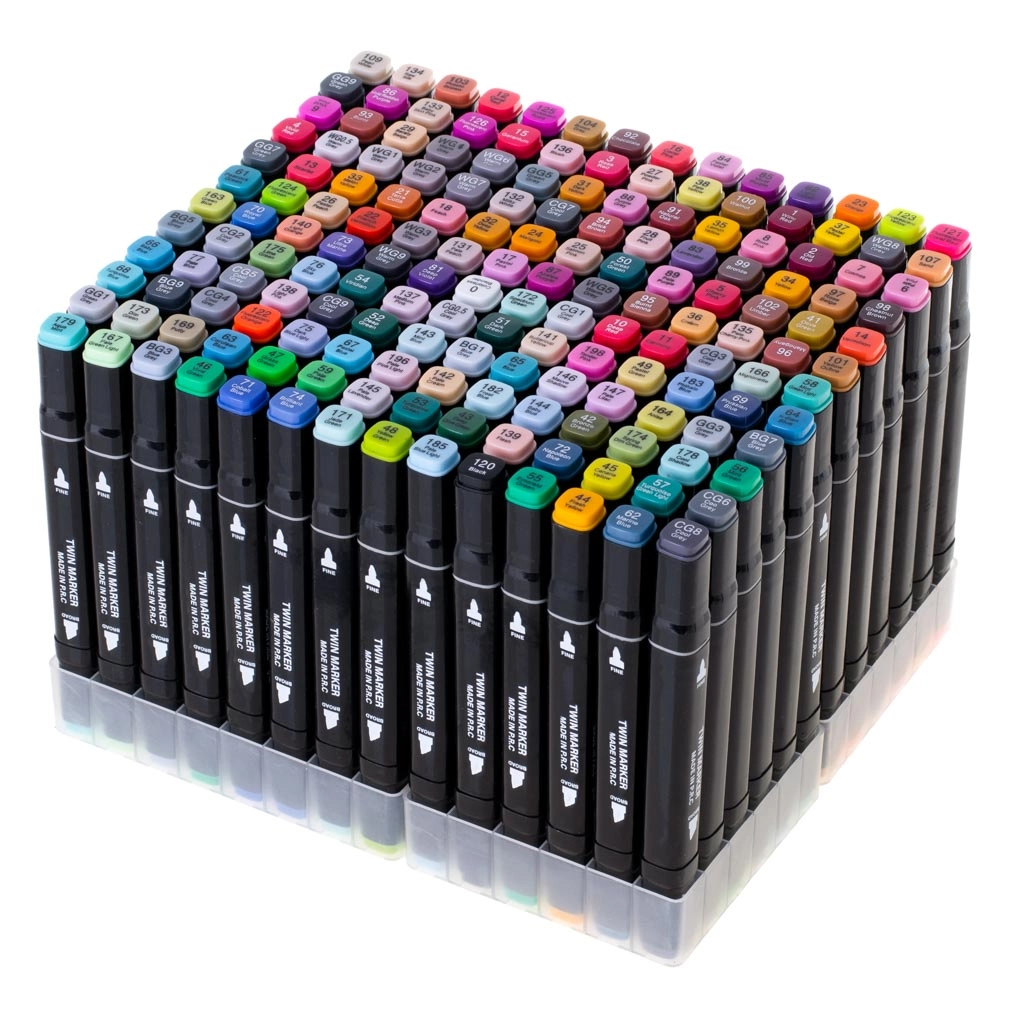 Šis pilnais komplekts piedāvā iespaidīgu toņu spektru jebkurai tehnikai. Spirta tinte ātri nožūst, lieliski klāj un nodrošina plūdenas pārejas bez nevēlamām švīkām. Katram marķierim ir 2 uzgaļi – plats virsmām un tievs līnijām un detaļām.