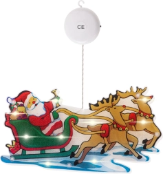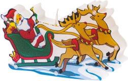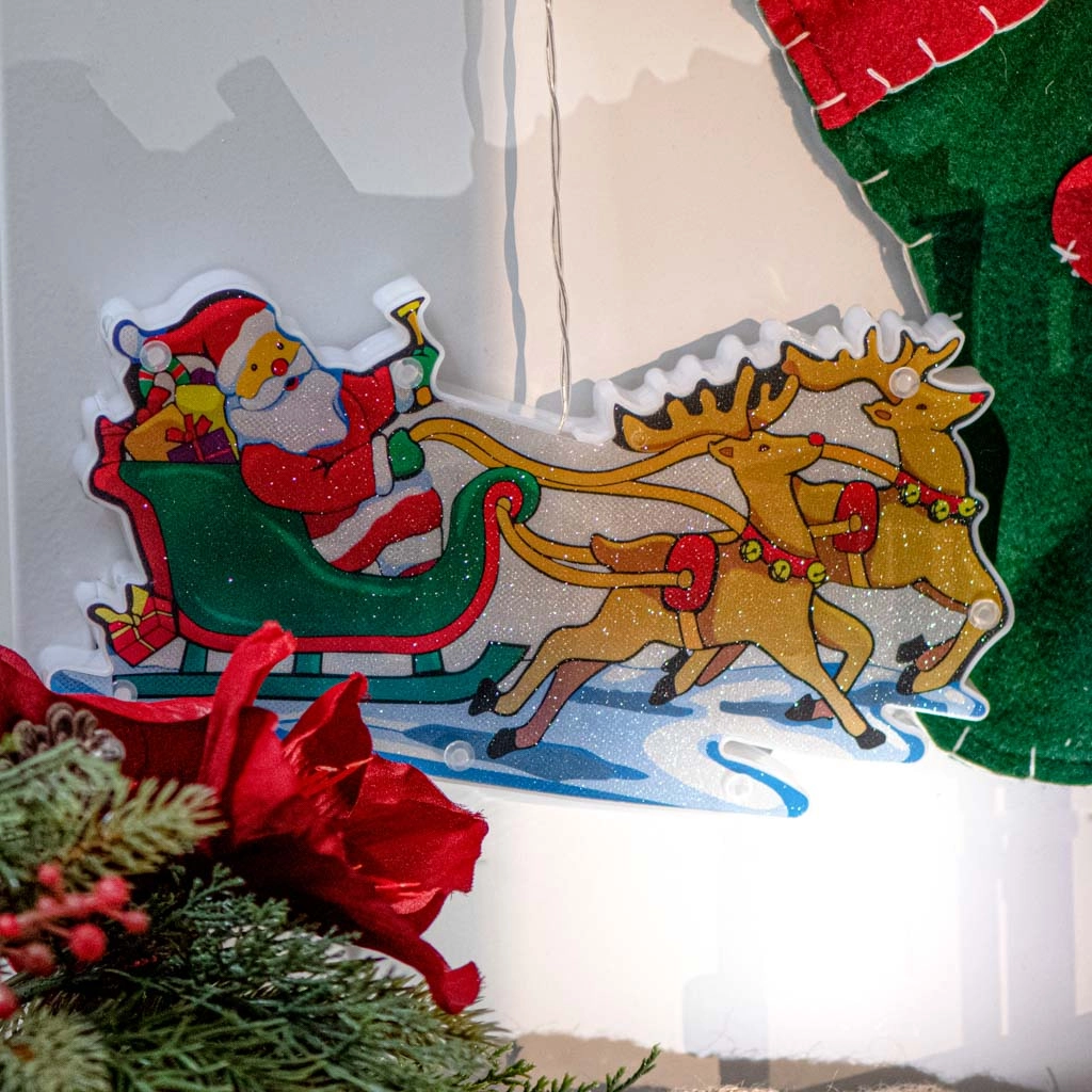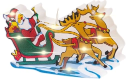 Šī krāsainā Ziemassvētku dekorācija ar Salatēvu kamanās un ziemeļbriežiem iemirdzas siltā baltā gaismā un piešķir jūsu interjeram mājīgu svētku noskaņu. Pateicoties divpusējam motīvam, tā lieliski izskatās no abām loga pusēm un piesaista garāmgājēju uzmanību.